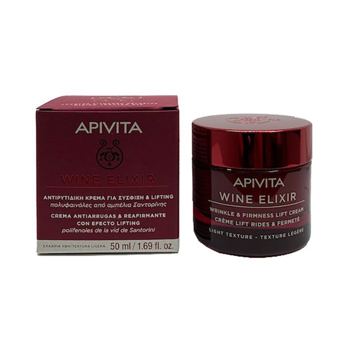 La crema aterciopelada Apivita Wine Elixir reactiva la juventud de la piel de la manera más eficiente, gracias a los polifenoles, que son potentes moléculas antienvejecimiento procedentes de las hojas de vid de Santorini. Reduce la aparición de arrugas, ofreciendo al mismo tiempo una piel y contornos más firmes gracias a los polifenoles de la vid de Santorini. Aumenta la densidad y elasticidad de la piel gracias al mástique. Protege del estrés oxidativo y de factores externos gracias al extracto patentado de propóleo. Hidrata gracias a la miel, la cera de abeja, el ácido hialurónico, la manteca de karité, el aceite de oliva y el aceite de semillas de uva. Rejuvenece tanto la piel como el estado de ánimo gracias a los aceites de neroli, pachulí, salvia esclarea y rosa. El agua de esta composición ha sido reemplazada por una infusión antioxidante de tres variedades de vid de Santorini (Athiri, Aidani y Assyrtiko) con propiedades antienvejecimiento.