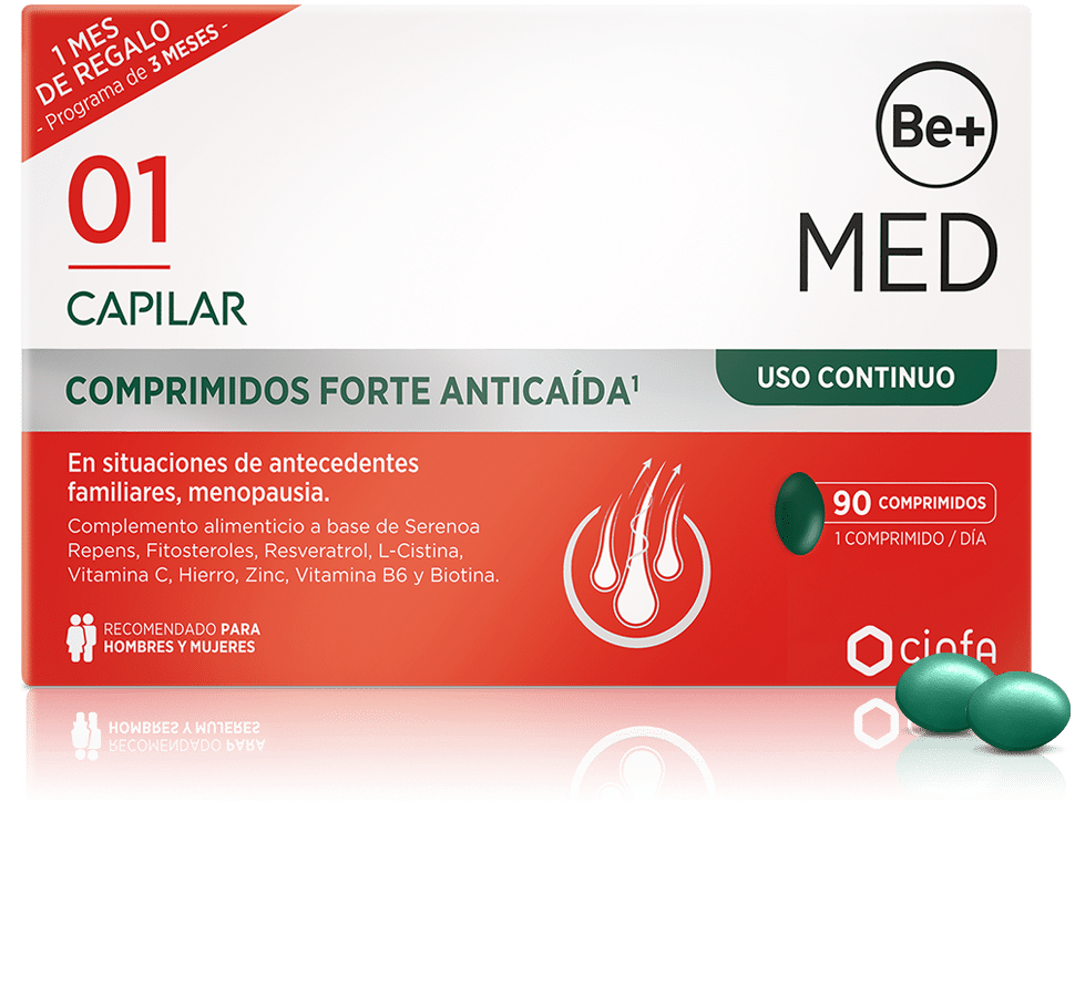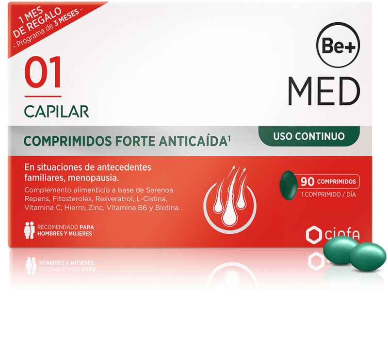 \r\nLa completa fórmula de Be+ Capilar Uso Continuo Forte, aporta diferentes ingredientes:\r\n\r\nSerenoa Repens: ayuda a mantener tu propio cabello.\r\n\r\nHierro: contribuye a mantener el transporte normal de oxígeno.\r\n\r\nZinc: contribuye al mantenimiento del cabello en condiciones normales y a mantener los niveles normales de testosterona.\r\n\r\nVitamina E y el Zinc: contribuyen a la protección de las células frente al daño oxidativo.\r\n\r\nVitamina B6 (Piridoxina): contribuye a la síntesis normal de la cisteína, componente de la estructura del cabello.\r\n\r\nVitamina B8 (Biotina): contribuye al mantenimiento del cabello en condiciones normales.\r\n\r\nTomar 1 comprimido al día. No superar la dosis diaria expresamente recomendada. Los complementos alimenticios no deben utilizarse como sustitutos de una dieta variada y equilibrada y un estilo de vida saludable. Mantener fuera del alcance de los niños más pequeños. No consumir más de 3 g de esteroles vegetales al día. No recomendado en mujeres embarazadas o en período de lactancia ni en niños. Consulte con su médico si está tomando medicamentos para reducir la colesterolemia. Conservar en un lugar seco y fresco en su envase original. Proteger de la luz y del calor. En base a la naturaleza de sus ingredientes, puede observarse un cambio de color del comprimido que no afecta a su eficacia. Sin colorantes artificiales.