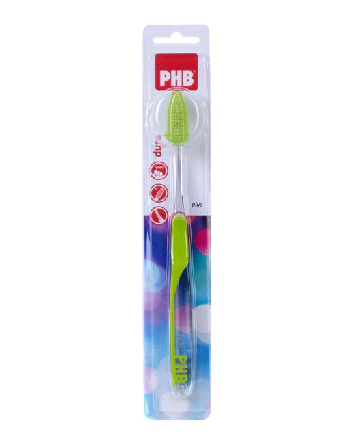 El Cepillo Dental Plus Duro PHB cuenta con un cabezal redondeado y de pequeño tamaño que facilita el cepillado y el acceso a las zonas más alejadas. Posee más de 1.800 filamentos de Tynex® agrupados en 71 mechones, que se distribuyen en la superficie del cabezal, proporcionando una máxima eficacia en la eliminación de placa bacteriana. Los filamentos presentan un corte curvado que se ajusta al movimiento manual del cepillado, logrando así un mayor arrastre bacteriano en dientes y encías, evitando posibles lesiones. Su cuello es fino y alargado para un mejor acceso a las zonas alejadas. El mango es ergonómico, anatómico y flexible, adaptándose perfectamente a la mano y a la forma de la boca, además de contar con un sistema grip antideslizante que evita que el mango resbale durante el cepillado. El capuchón protector mantiene el cepillo aislado de contaminaciones externas y los filamentos agrupados. También tiene una guía de entrada para que los filamentos se sequen sin tocar la pared y evitar el crecimiento de bacterias, prolongando así la vida del cepillo.