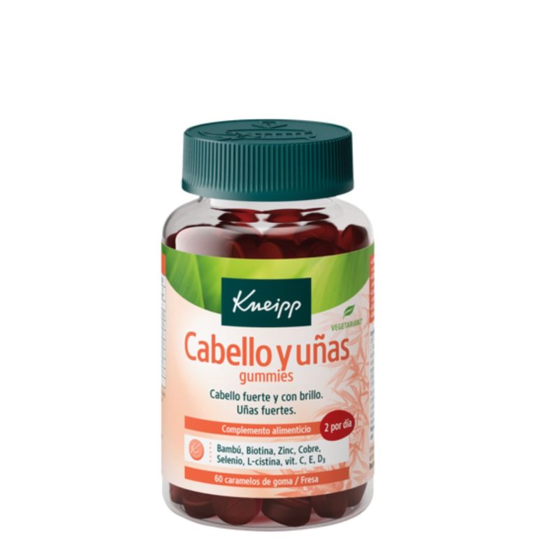 Kneipp® Cabello y Uñas gummies es un complemento alimenticio que ayuda a tener un cabello fuerte y con brillo, y unas uñas fuertes.\r\n\r\nCaracterísticas:\r\n\r\n• Sabor Fresa\r\n\r\n• Producto apto para vegetarianos\r\n\r\n• Sin sabores artificiales ni edulcorantes\r\n\r\n• Sin gluten y sin lactosa\r\n\r\n• 60 caramelos de 3g\r\n\r\nModo de acción:\r\n\r\n• La Biotina, el Selenio y el Zinc contribuyen a mantener el cabello en condiciones normales.\r\n\r\n• El Zinc y el Selenio contribuyen a mantener las uñas en condiciones normales.\r\n\r\n• La vitamina E contribuye a la protección de las células frente al estrés oxidativo.\r\n\r\n• El Cobre contribuye a la pigmentación normal del cabello.\r\n\r\n• El bambú tradicionalmente se ha considerado un secreto de belleza.