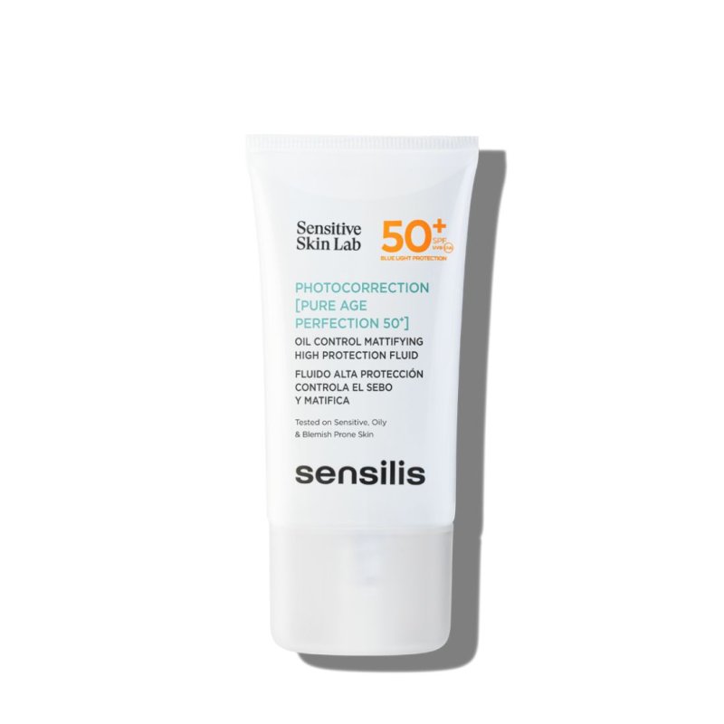 Fluido con alta protección 50+ que controla el sebo, matifica y protege de los rayos UVA, UVB y de la luz azul a las pieles sensibles, grasas y con tendencia acneica. Formulado con Azeloglicina y Prebióticos, por su acción seborreguladora, Microesferas de Sílice, por su acción matificante, Ácido Lactobiónico, por su poder hidratante, y Alfa-Bisabolol, por su efecto calmante.\r\n\r\n¿Es para ti? Photocorrection [Pure Age Perfection 50+] es para pieles sensibles, grasas o con tendencia acneica.\r\n\r\nHipoalergénico. No comedogénico. Testado en 5 metales pesados. Sweat Resistant.