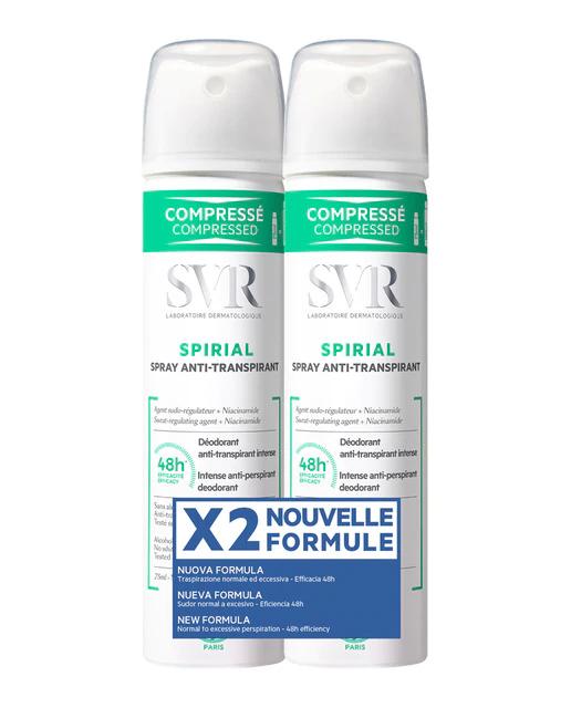 El Spray Duo Spirial SVR es un desodorante antitranspirante intenso que ofrece 48 horas de eficacia y tolerancia, especialmente formulado para las pieles sensibles. Su formato incluye dos envases de 75 ml cada uno. La fórmula proporciona un acabado seco inmediato y combate las manchas amarillas y blancas, sin dejar efecto cartón. Los ingredientes principales son clorhidrato de aluminio y niacinamida.